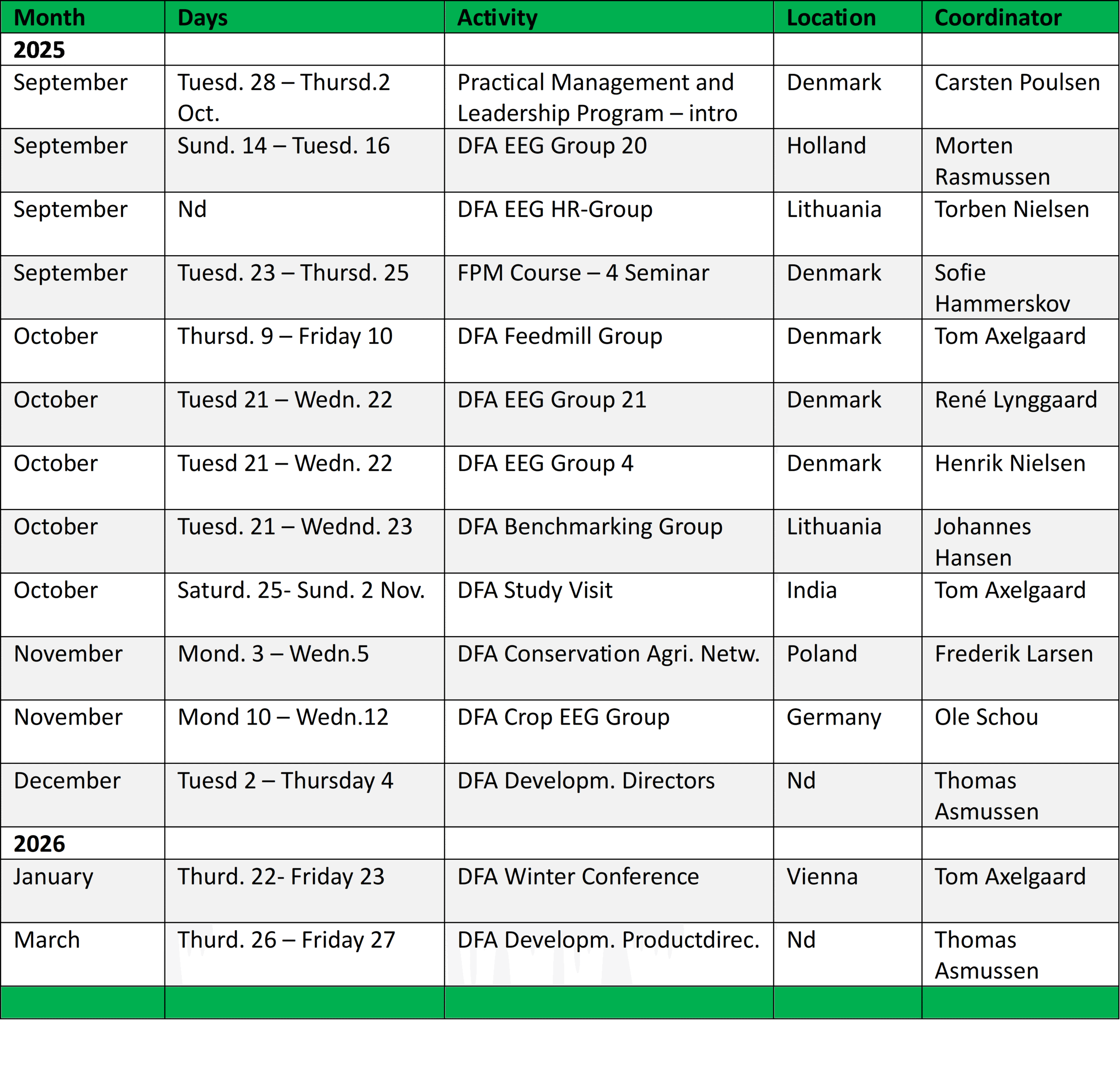 This site presents a chronological overview of all activities including time, location, etc. The overview is updated 5 times a year related to the publication of a newsletter.